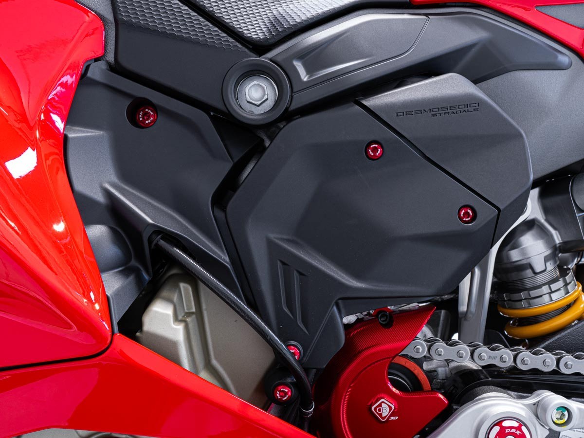Kit of screws made from solid aluminum alloy (Ergal 7075) through high-precision CNC machining. The screws undergo a colored anodized surface treatment that enhances corrosion and wear resistance, while also providing a sleek and customized look. This kit offers a combination of lightness, durability, and style for your motorcycle, ensuring high performance and a distinctive appearance.
