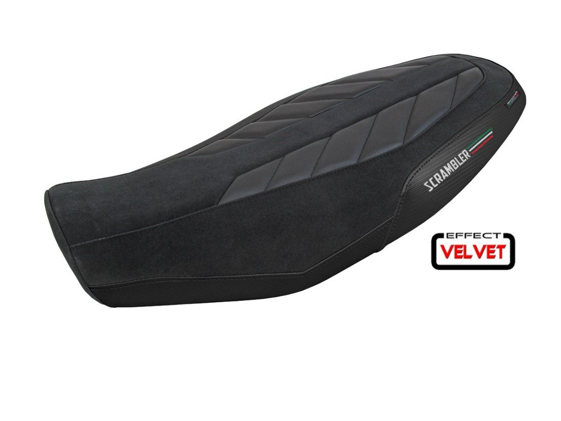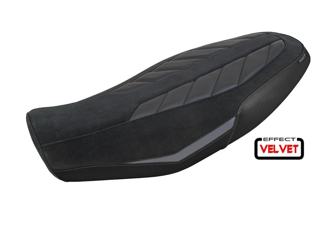 Exclusive seat cover made of black velvet effect. Laterals in black carbon look and inserts.